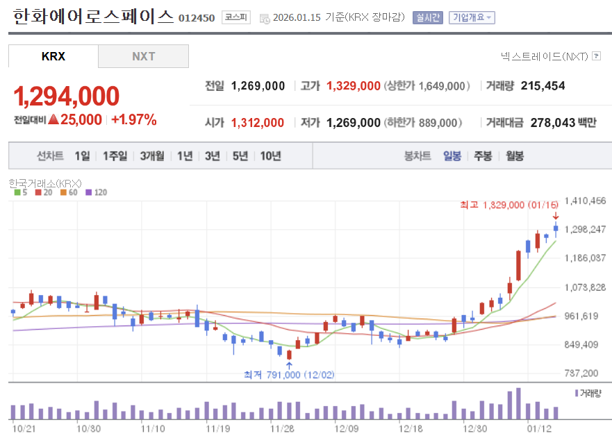 한화에어로스페이스는 방산 섹터가 강해질 때 수급이 가장 먼저 집중되는 축이 되기 쉬운 종목입니다. 실적 스케일이 커질수록 기관·외국인 수급 측면에서도 유리한 구조가 형성되는 편입니다.