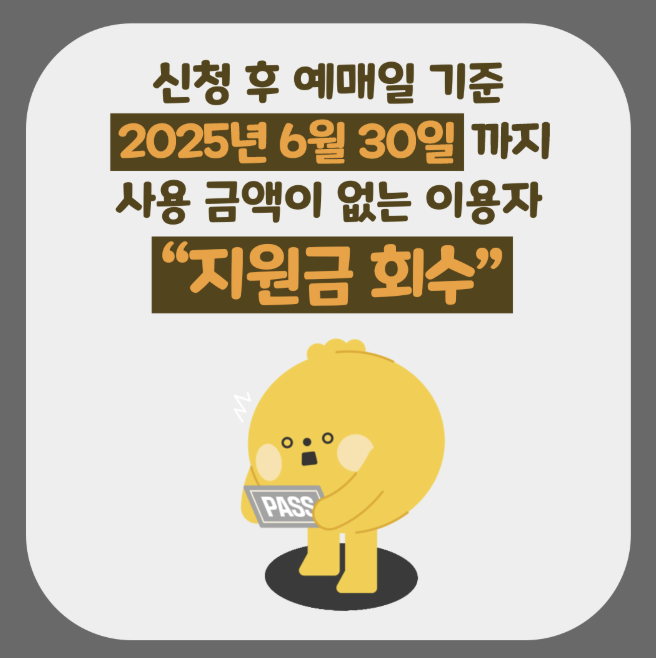 - 신청 후 예매일 기준 2025.6.30 (월) 까지 사용 금액이 없는 경우 이용자 지원금 회수